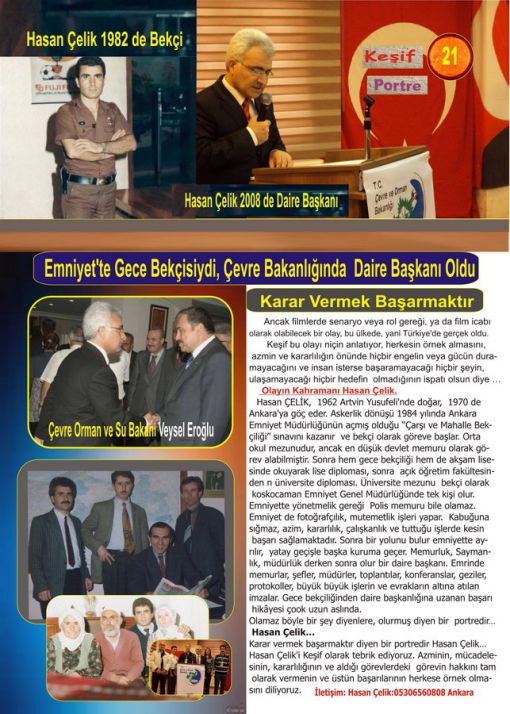 Hasan Çelik Orman ve Su İşleri Bakanlığı Daire Başkanı Ankara 05306560808 ![]() 0505 4032970 ![]() ![]() ![]() ![]() ![]() ![]() ![]() ![]() ![]() ![]() ![]() ![]() ![]() ![]() ![]() ![]() Keşif Dergisi 3. Sayı. 21 Sayfada haber 21.Sayfa Karar Vermek Başarmaktır Emniyet’te Gece Bekçisiydi, Çevre Bakanlığında Daire Başkanı Oldu Ancak filmlerde senaryo veya rol gereği, ya da film icabı olarak olabilecek bir olay, bu ülkede, yani Türkiye’de gerçek oldu. Keşif bu olayı niçin anlatıyor, herkesin örnek almasını, azmin ve kararlılığın önünde hiçbir engelin veya gücün duramayacağını ve insan isterse başaramayacağı hiçbir şeyin, ulaşamayacağı hiçbir hedefin olmadığının ispatı olsun diye … Paylaşıyoruz. Olayın kahramanı Hasan Çelik. Hasan ÇELİK, 1962 Artvin Yusufeli’nde doğar, 1970 de Ankara’ya göç eder. Askerlik dönüşü 1984 yılında Ankara Emniyet Müdürlüğünün açmış olduğu “Çarşı ve Mahalle Bekçiliği” sınavını kazanır ve bekçi olarak göreve başlar. Orta okul mezunudur, ancak en düşük devlet memuru olarak görev alabilmiştir. Sonra hem gece bekçiliği hem de akşam lisesinde okuyarak lise diploması, sonra açık öğretim fakültesinden n üniversite diploması. Üniversite mezunu bekçi olarak koskocaman Emniyet Genel Müdürlüğünde tek kişi olur. Emniyette yönetmelik gereği Polis memuru bile olamaz. Emniyet de fotoğrafçılık, mutemetlik işleri yapar. Kabuğuna sığmaz, azim, kararlılık, çalışkanlık ve tuttuğu işlerde kesin başarı sağlamaktadır. Sonra bir yolunu bulur emniyette ayrılır, yatay geçişle başka kuruma geçer. Memurluk, Saymanlık, müdürlük derken sonra olur bir daire başkanı. Emrinde memurlar, şefler, müdürler, toplantılar, konferanslar, geziler, protokoller, büyük büyük işlerin ve evrakların altına atılan imzalar. Gece bekçiliğinden daire başkanlığına uzanan başarı hikâyesi çook uzun aslında. Olamaz böyle bir şey diyenlere, olurmuş diyen bir portredir … Hasan Çelik… Hasan Çelik’i Keşif olarak tebrik ediyoruz. Azminin, mücadelesinin, kararlılığının ve aldığı görevlerdeki görevin hakkını tam olarak vermenin ve üstün başarılarının herkese örnek olmasını diliyoruz. İletişim: Hasan Çelik:05306560808 Ankara Hasan Çelik Kimdir… Hasan ÇELİK 12.02.1962 yılında Artvin İli Yusufeli İlçesinin Çeltikdüzü köyünde dünyaya geldi. Birinci sınıfı köy ilkokulunda okuduktan sonra, abilerinin Ankara’da yaşamalarından dolayı, onlarda köylerinden Ankara’ya 1970 yılında göç ettiler. İlkokulu bitirdikten sonra yazları fotoğrafçının yanında çırak olarak çalışmaya başladı ve okul dönemlerinde de öğlene kadar fotoğrafçıya öğleden sonraları da orta okula devam etti. 1978 yılından sonra Fotoğrafçının yanında çalışmaya devam etti. 1982 yılında askere gitti. 1984 yılında Sema Kaçar ile hayatını birleştirdiği eşinden biri kız biri erkek olmak üzere 2 çocuğu olan Hasan ÇELİK, Askerlik dönüşü 1984 yılında Ankara Emniyet Müdürlüğünün açmış olduğu Çarşı ve Mahalle Bekçiliği sınavını kazandı, 04.12.1984 yılında aday memur olarak göreve başladı. Ankara’da Mamak İlçesi Kayaş Karakolunda ve Yenimahalle İlçesi Karşıyaka karakollarında toplam 10 ay görev yaptıktan sonra mesleğinden dolayı, Ankara Emniyet Müdürlüğü Foto-Film Şube Müdürlüğünde fotoğrafçı olarak görevine devam etti. Eşinin ve arkadaşlarının teşviki ile yarım kalan eğitimini tamamlamak üzere, o dönemlerde olan Akşam Lisesine kayıt yaptırdı, 4 yıllık bir eğitim sonunda Gazi Akşam Lisesinden 1990 yılında mezun oldu. (Sabah saat 07:30 da evden çıkıp akşamları saat 23-23:30 saatlerine kadar devam eden bu koşuşturmada bir ara nerdeyse okulu bırakıyordum, ancak eşimin beni teşviki ile okula devam edip mezun oldum. Hani derler her başarılı erkeğin arkasında bir eş vardır, işte eşimin de bu başarıda payı büyüktür. Ne kadar teşekkür etsem azdır.) Daha sonra üniversite sınavlarına girdi, 1994 yılında üniversiteye kayıt yaptırdı. Hem çalışmaya devam etti hem de okuluna ve 1997 yılında Haziran döneminde Anadolu Üniversitesi Sosyal Bilimler Fakültesinden mezun oldu. Yüksek okuldan mezun olduktan sonra, Ankara Emniyet Müdürlüğünde kalması halinde görevde yükselme imkanı olmadığından kurum değiştirdi. 1998 yılı başında, Çevre Bakanlığı İdari ve Mali İşler Dairesi Başkanlığı bünyesine Ambar Memuru Kadrosu ile yatay geçiş yaptı. Bu görevi de başarıyla 9 ay yürüttükten sonra, aynı Başkanlık bünyesinde bulunan Ayniyat Saymanlığı kadrosuna atandı. Bu görevi de 5 buçuk yıl başarıyla yürüttükten sonra, Çevre Bakanlığının Şube Müdürlüğü kadrosu için açmış olduğu Görevde Yükselme Sınavına katılıp başarılı oldu. 2003 yılında Gümüşhane İl Müdürlüğü bünyesine Şube Müdürü olarak atandı. O dönemde Bakanlıkların yeniden yapılanması sebebiyle ancak 2004 yılının Mart ayının 25 inde Gümüşhane İl Çevre ve Orman Müdürlüğünde İdari ve Mali İşler Şube Müdürü olarak göreve başladı. Gümüşhane de 3 buçuk yıllık başarılı hizmetinden sonra, tayin talebinde bulunarak, 06.08.2007 tarihinde Ankara’ya, Çevre ve Orman Bakanlığı Merkez Teşkilatında, Bilgi İşlem Dairesi Başkanlığı bünyesine yine Şube Müdürü olarak atandı. Buradan da yine Bakanlık İdari ve Mali İşler Dairesi Başkanlığı bünyesindeki İdari ve Sosyal İşler Şube Müdürlüğü görevine atandı. 2008 yılı Aralık ayının başında Bakanlık İdari ve Mali İşler Dairesi Başkanlığı görevini 01.08.2011 tarihine kadar (32 ay vekaleten) başarıyla yürüttü. Daha sonra 2011 yılı Kasım ayında Orman ve Su İşleri Bakanlığı, Strateji Geliştirme Başkanlığı bünye