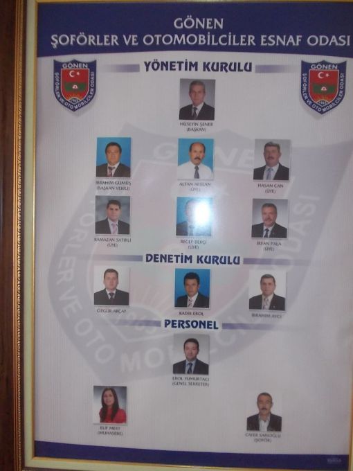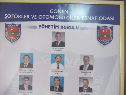 Gönen Şöforlar ve Otomobilciler Esnaf Odası Başkanlığı Başkan Hüseyin Şener 05422572088 Başkan Yardımcısı İbrahim Gümüş Genel Sekreter Erol Yumurtacı 0266 762 2558 Diğer Yönetim Kurulu Üyeleri Altan Aslan Ramazan Satırlı İrfan Pala Recep Bekçi Gürkan İnceoğlu Odamızla İlgili Bilgiler Odamızın 464 üyeyi, 30 Tonluk Kurtarıcısı, 2.30 Tonluk Kurtarıcısı, Ambulansı bulunmaktadır Odamız Üyelerimizin ulaşım ve mesleki alanda her türlü iş ve işlemlerini takip ederek izlemekte ve sorunlarını çözüme kavuşturmada yardımcı olmaktadır 1965 yılında kurulan Odamız 4 katlı Kendi binasında hizmet vermektedir 74.000 Nüfuslu Gönen İlçemizde 19.11.2013 yılı itibarıyla 24.745 adet kayıtlı araç bulunmaktadır Altay Mah. 10. Sok. No:5 Gönen Merkez, Gönen, Balıkesir