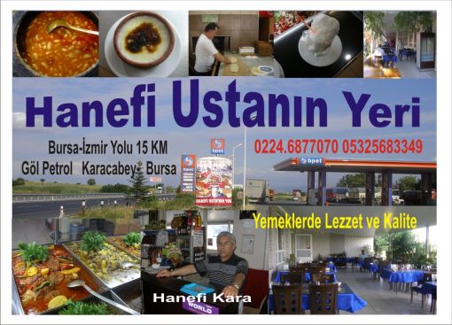 Hanefi Ustanın Yemeklerinin Sırrı Ne Yıllardır Göl Kenarındaki lokantasında çeşitli yemekleri yaparak müşterilerine sunan Hanefi Karayı nedense kamyon şöforları çok seviyor. Yıllardır şöforluk yaptıklarını ve yollarda yemek yemek zorunda olduklarını söyleyen kamyon şöforları, nereye gidersek gidelim, nereden gelirsek gelelim yemek vaktimizi burada geçiriyoruz ve mutlaya Hanefi Ustanın yaptığı yemekleri yiyoruz diyorlar. Sebebi nedir diye sorduğumuzda çok lezzetli, bu lezzeti başka hiç bir yerde bulamadık. Hem temiz ve manzaralı bir mekan, hem lükx ve hem de bizim için en iyi olan hasaplı yemek vermesi diyorlar. Kalite, lezzet ve ucuzluğu müşterilerine birlikte sunan Hanefi Usta yemekleri nasıl bu şekilde lezzetli yaptığının sırrını açıklamıyor. Hanafi Ustanın lokantası Karacabeyden Bursaya giderken Ulubatı geçtikten sonra sağda Bpet Benzin istaasyonu içinde ve Ulubat gölünün hemen kenarında bulunuyor. Yolu düşenlerin bir lezzet denemesi yapmalarında yarar görüyoruz.. 0224.6877070 05325683349 05353818222 Hanefi Ustanın Yerini Gömek için- Tıklayın