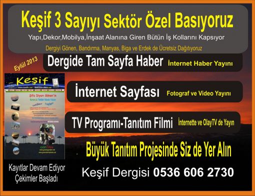 Keşif 3 Sayıyı Sektör Özel BasıyoruzKeşif 3 Sayıyı Sektör Özel Basıyoruz Eylül 2013 Yapı,Dekor,Mobilya,İnşaat Alanına Giren Bütün İş Kollarını Kapsıyor Dergiyi Gönen, Bandırma, Manyas, Biga ve Erdek de Ücretsiz Dağıtıyoruz